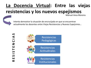 El documento describe la situación actual de los docentes en educación a distancia, quienes se encuentran entre viejas resistencias y nuevos espejismos. Por un lado, enfrentan resistencias pedagógicas, actitudinales e institucionales a la educación en línea. Por otro lado, existen discursos utópicos sobre el poder de las tecnologías para transformar el sistema educativo. Finalmente, se argumenta que los docentes requieren desarrollar nuevas habilidades y competencias digitales para encontrar un equilibrio efectivo en la docencia virtual.