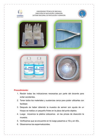 El documento describe un experimento para observar espermatozoides utilizando un microscopio. El procedimiento incluye obtener una muestra de semen, colocarla en un portaobjetos y observarla a diferentes aumentos para ver las características de los espermatozoides como la cabeza, cola y estructuras internas. Los estudiantes pudieron observar los espermatozoides con más claridad a 40 aumentos y concluyeron que el microscopio es una herramienta útil para este tipo de análisis.
