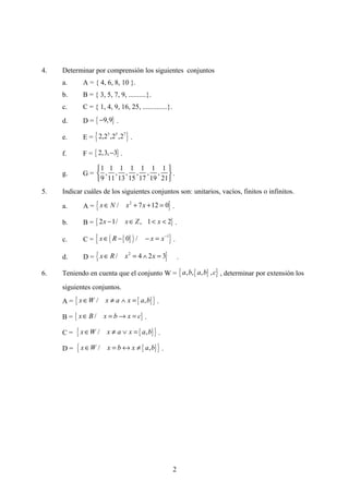 2) Los ejercicios están organizados en cinco grupos y cubren temas como propiedades de conjuntos vacíos y unitarios, comprensión y extensión de conjuntos, operaciones lógicas entre conjuntos, y demost