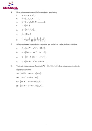 Este documento presenta una serie de ejercicios sobre conjuntos. Incluye ejercicios para determinar conjuntos por extensión, comprensión y operaciones entre conjuntos como unión e intersección. También incluye proposiciones sobre conjuntos y su valor de verdad, así como representaciones gráficas de relaciones entre conjuntos a través de diagramas de Venn y Euler. En total, contiene 10 grupos de ejercicios sobre diferentes temas relacionados con conjuntos.