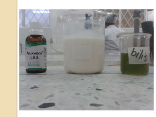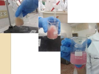 Este documento describe un experimento sobre la acción de enzimas. Se tomaron 5 tubos de ensayo con leche y pancreatina y se sometieron a diferentes tiempos en un baño de agua. A mayor tiempo de exposición, se requirió más hidróxido de potasio para titular la mezcla, lo que indica mayor descomposición de la leche. También se probó pancreatina con aceite, pero no hubo reacción ni mezcla.