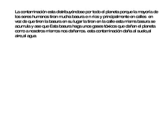 La contaminación se está extendiendo por todo el planeta debido a que la mayoría de las personas arrojan grandes cantidades de basura en ríos y calles en lugar de desecharla correctamente, lo que genera gases tóxicos que dañan al planeta y a los seres humanos. La contaminación del suelo, el aire y el agua perjudica a los animales y puede matarlos al exponerlos a sustancias dañinas. Los humanos contribuyen a la contaminación al tirar basura de forma irresponsable, lo que afecta negativamente no solo a las personas