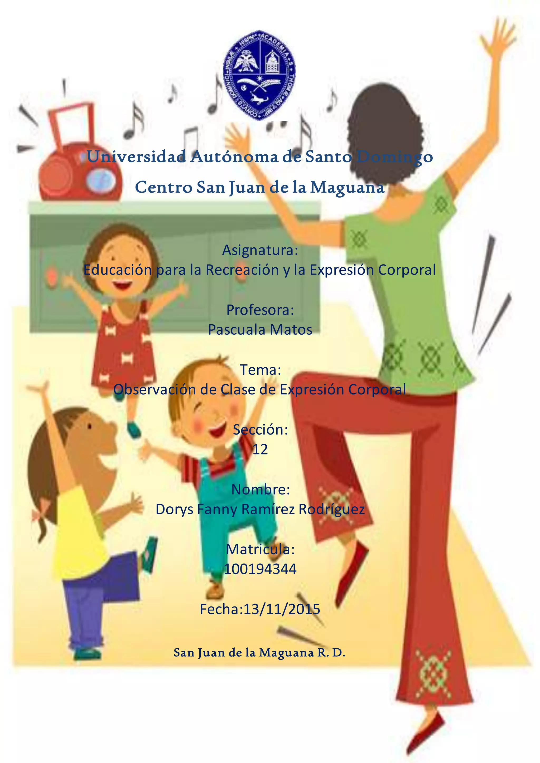 El documento describe una observación de una clase de expresión corporal en un centro educativo. La autora observó varios ejercicios que involucraban movimientos y desplazamientos corporales, como gatear, brincar, correr y jugar voleibol. Algunos niños tuvieron dificultades pero todos se divirtieron. Para finalizar, los niños compartieron sus experiencias y cantaron una canción.