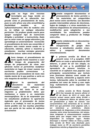 El procesamiento de texto ha tenido un gran impacto en la educación porque ofrece versatilidad, flexibilidad y puede usarse para apoyar cualquier tipo de instrucción. Los maestros pueden usarlo para modificar materiales de manera más eficiente y los estudiantes pueden compartir e ideas y trabajos entre ellos. El procesamiento de texto también permite que los documentos se vean más elegantes y profesionales.