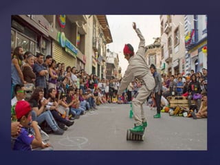 El documento habla sobre el Festival de Artes Vivas de Loja que se realizó del 15 al 25 de noviembre de 2018. El festival convocó a artistas nacionales e internacionales de diferentes disciplinas como teatro, música, danza y artes plásticas. Durante los 10 días del evento, los habitantes de Loja pudieron presenciar y participar en varios espectáculos en teatros, calles y plazas públicas. El festival buscó aprovechar el patrimonio cultural inmaterial de la región y convertir a Loja en un destino tur