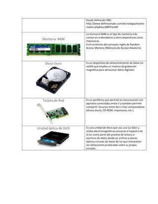 Este documento describe los principales componentes de una computadora, incluyendo el gabinete, monitor, teclado, mouse, bocinas, tarjeta madre, memoria RAM, disco duro, tarjeta de red y unidad óptica. Cada componente se define brevemente indicando su función principal dentro de la computadora.