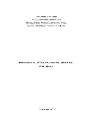 Este documento presenta una guía práctica sobre el control de calidad de la leche cruda. Explica la importancia de controlar la calidad de la leche cruda como materia prima de la industria láctea y describe las pruebas comúnmente utilizadas para determinar la calidad sanitaria de la leche, como la temperatura, características organolépticas, peso específico y lactofiltración. También cubre temas como la toma de muestras, almacenamiento y transporte de muestras para análisis posteriores