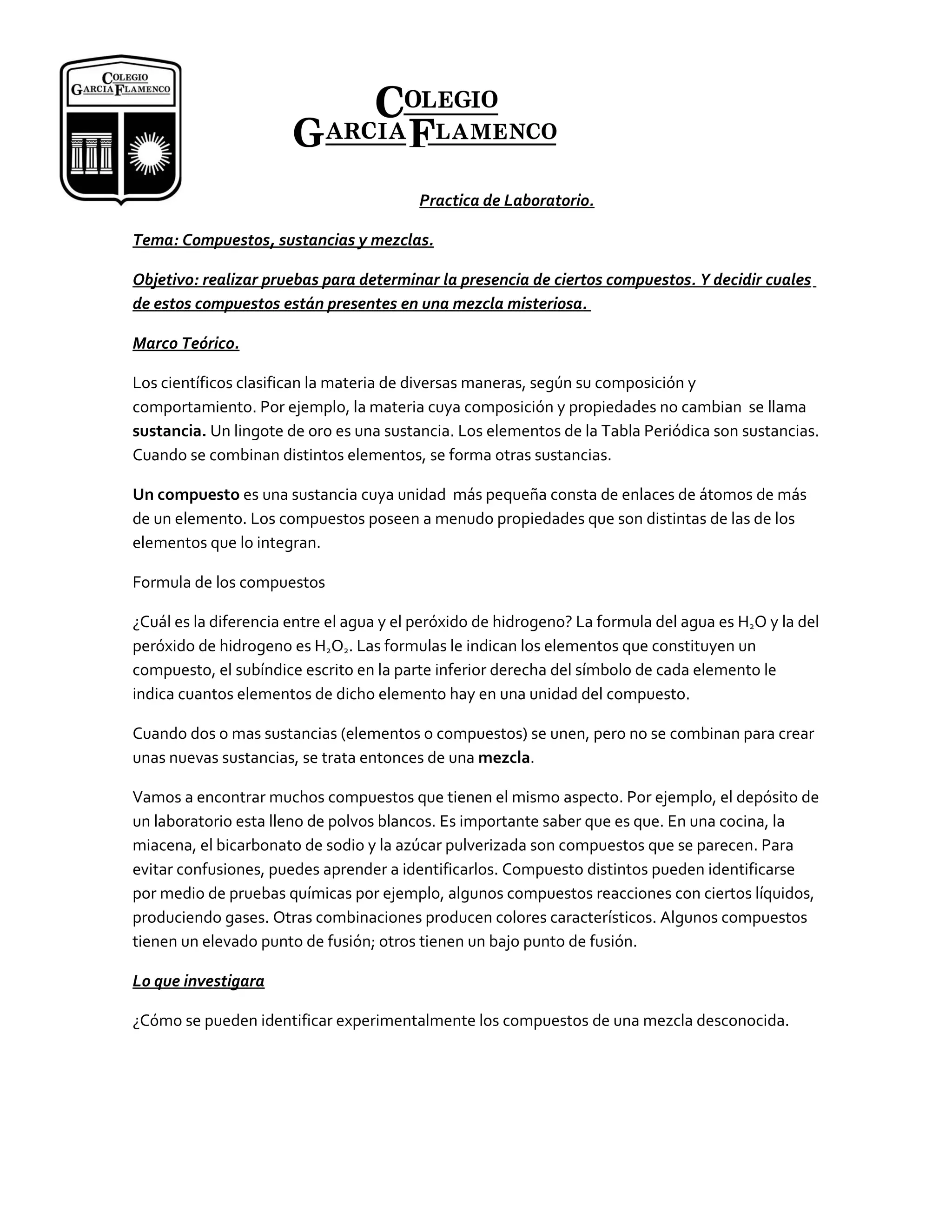 Este documento presenta un experimento para identificar compuestos desconocidos en una mezcla a través de pruebas químicas. Se probará maicena, azúcar y bicarbonato de sodio con vinagre, yodo y calor para observar sus reacciones distintivas. Luego se aplicarán las mismas pruebas a la mezcla misteriosa para determinar qué compuestos contiene basándose en las observaciones.