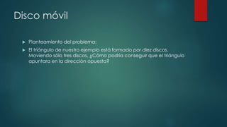 Este documento describe un experimento realizado por estudiantes para invertir un triángulo equilátero de 10 monedas con solo 3 movimientos. En el primer intento no pudieron lograrlo, pero después de varios intentos descubrieron que moviendo la moneda 1 entre las 8 y 9, la 7 junto a la 2 y la 10 junto a la 3 podían invertir el triángulo como se requería. Al final, concluyeron que a través de múltiples intentos aprendieron cómo mover las piezas para cumplir con el objetivo en solo 3