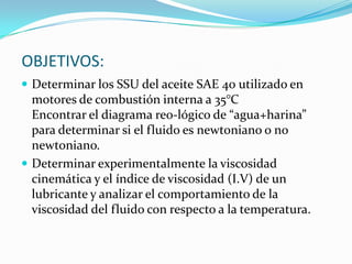 Este documento describe un laboratorio sobre viscosidad y fluidos no newtonianos. Los objetivos son determinar la viscosidad del aceite SAE 40 a 35°C usando un viscosímetro de Saybolt y encontrar el diagrama reológico de una mezcla de agua y harina para verificar si es newtoniano o no newtoniano. Los estudiantes medirán la viscosidad cinemática y el índice de viscosidad de un lubricante y analizarán cómo cambia la viscosidad con la temperatura. Finalmente, concluirán si la mezcla de agua y harina es