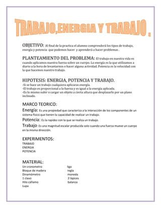 Este documento presenta los objetivos y materiales necesarios para realizar varias prácticas sobre energía, trabajo y potencia. La primera práctica trata sobre calcular el trabajo realizado al subir un objeto a cierta altura. Otra práctica identifica manifestaciones de energía como energía potencial y cinética al estirar y soltar una liga. Una práctica final observa el efecto de fuerzas al medir la fuerza necesaria para iniciar el movimiento de un bloque de madera.