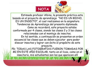 Este documento presenta las cuatro clases necesarias para disecar insectos como parte de un proyecto educativo. La primera clase introduce el tema e instruye a los estudiantes a recolectar insectos. Las clases 2 y 3 guían a los estudiantes en el proceso de disecar los insectos, incluyendo inyectarlos con alcohol y fijarlos en una placa. La cuarta clase muestra las muestras secas y terminadas en cajas entomológicas. El objetivo general es identificar la diversidad biológica de los insectos y su