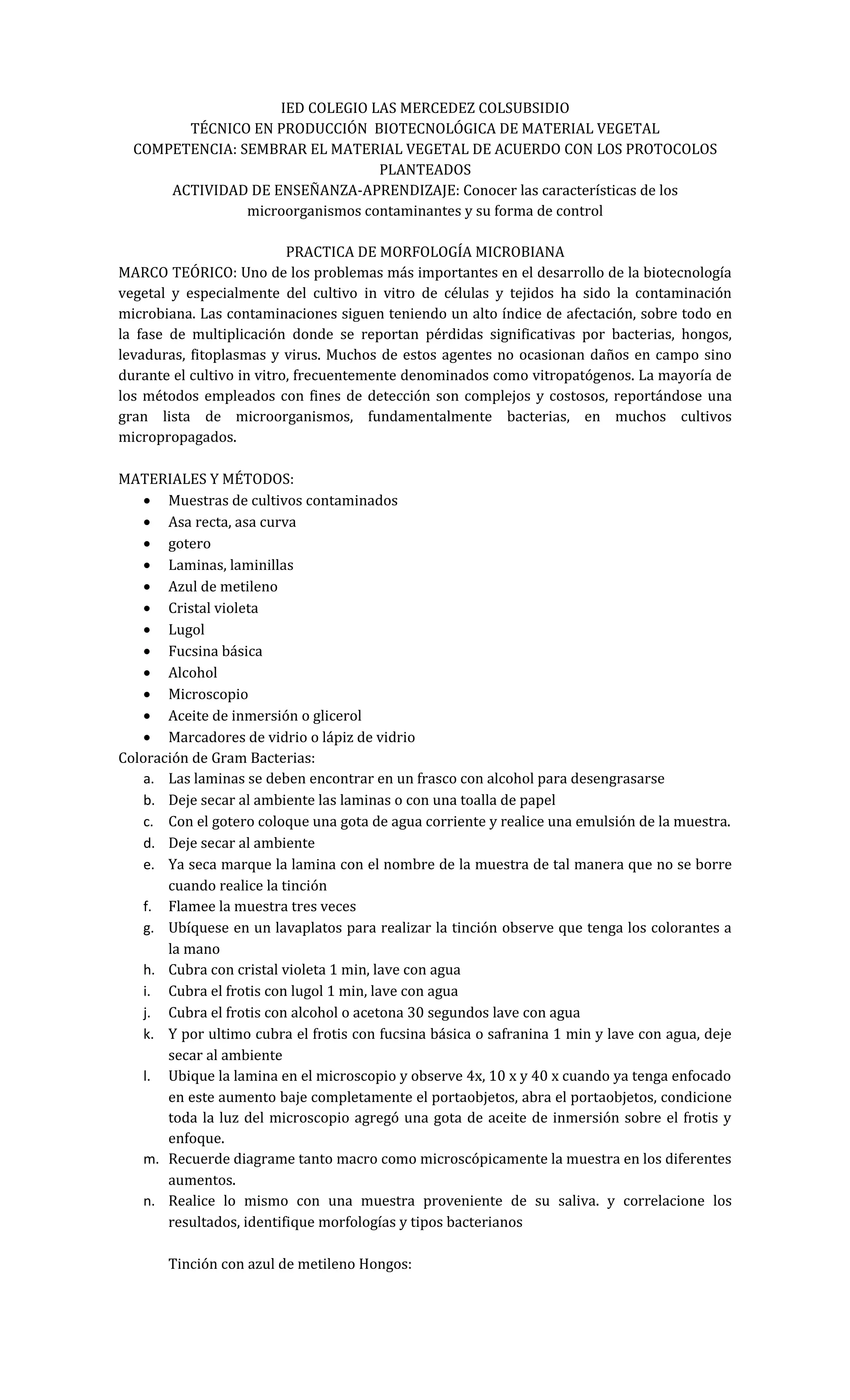 Este documento presenta un protocolo para identificar microorganismos contaminantes en cultivos vegetales mediante tinción y microscopía. El protocolo incluye la tinción de Gram para bacterias y tinción con azul de metileno para hongos usando muestras contaminadas, seguido de observación microscópica y diagramación de las estructuras identificadas. El documento también proporciona preguntas sobre los fundamentos de las tinciones, microorganismos contaminantes comunes y actividades que contribuyen o disminuyen la contaminación.