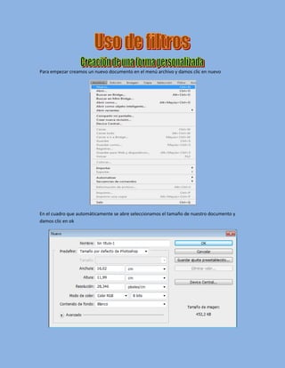 El documento describe los pasos para crear una forma personalizada en una capa y aplicarle filtros como semitono y esponja. Se explica cómo abrir una imagen, aplicarle el filtro licuar usando herramientas como deformar y tubulencia, y guardar los cambios.