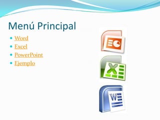 El documento describe tres aplicaciones de Microsoft Office: Word, Excel y PowerPoint. Word es para crear y editar documentos escritos, Excel permite manipular y analizar datos numéricos y alfanuméricos a través de fórmulas y gráficos, y PowerPoint es para crear presentaciones, comúnmente usado en negocios y educación.