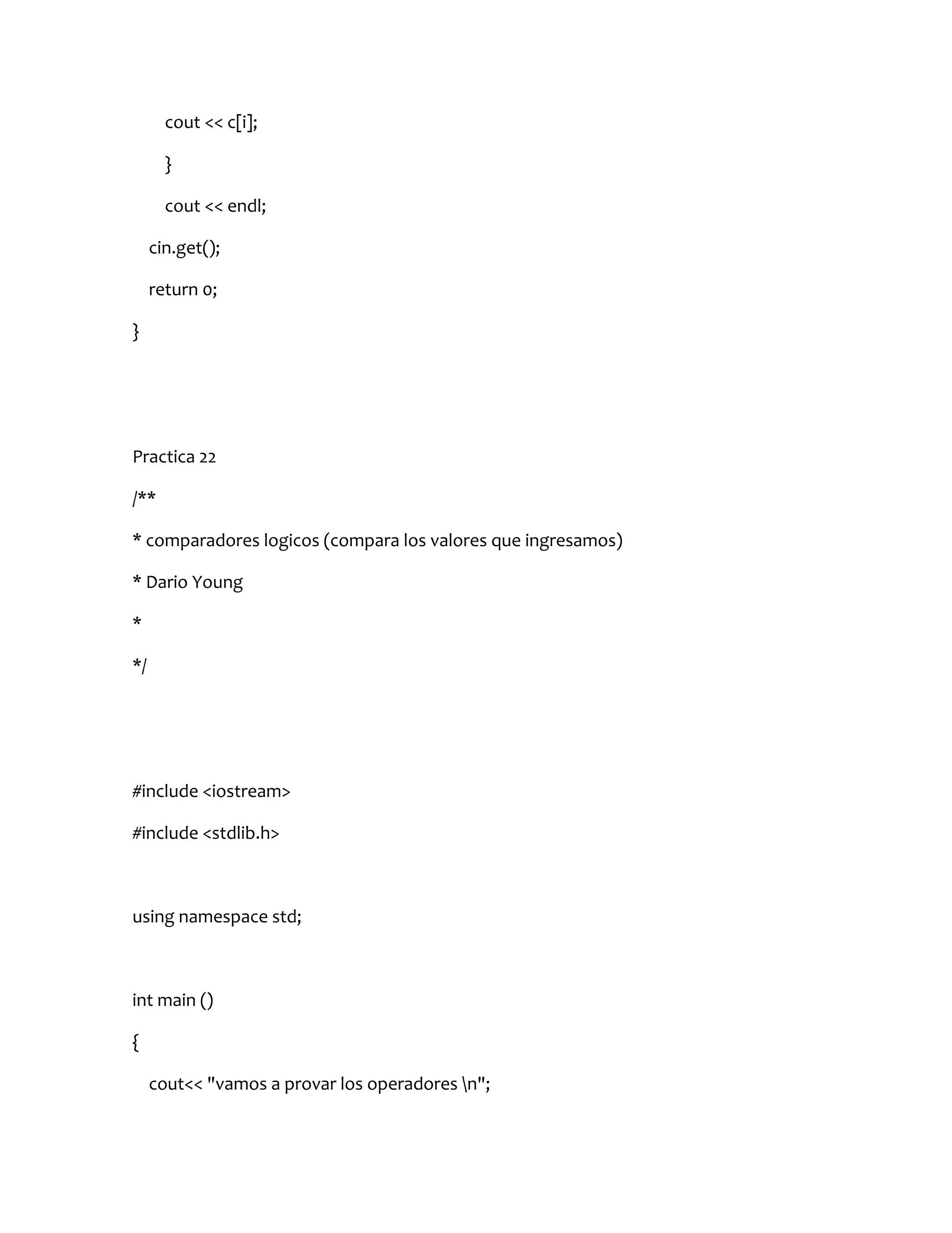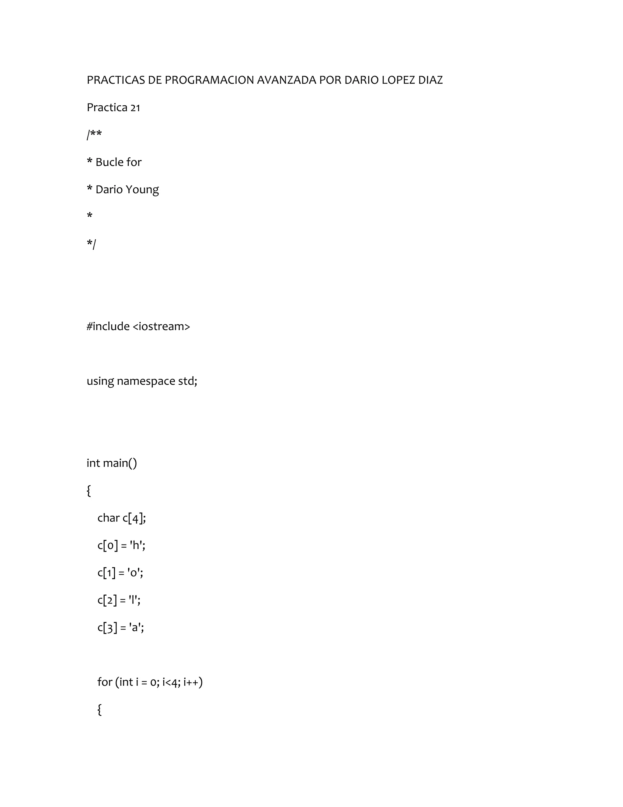 Este documento contiene 28 prácticas de programación avanzada en C++ realizadas por Dario López Díaz. Cada práctica presenta un programa C++ que ilustra un concepto de programación diferente, como bucles for, comparadores lógicos, operadores aritméticos y de comparación, condicionales if/else y cadenas. Los programas van aumentando en complejidad a lo largo de las prácticas para practicar diferentes funcionalidades del lenguaje C++.