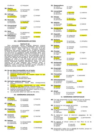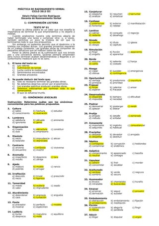 El documento trata sobre un examen de razonamiento verbal que incluye secciones de comprensión lectora, sinónimos léxicos y contextuales. En la primera sección de comprensión lectora, el texto habla sobre la importancia de terminar lo que emprendemos y no dejarlo a medias. En la segunda sección, se pide determinar sinónimos para palabras propuestas. La tercera sección incluye otro texto sobre fijarnos metas que nos exijan pero sean alcanzables.