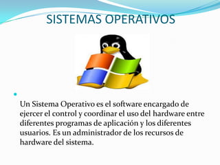 El documento proporciona información sobre sistemas operativos. Define un sistema operativo y describe Ubuntu, Linux y Windows como ejemplos principales. Compara Linux y Windows y describe varias versiones de Windows como Windows 95, Windows 3.1, Windows 7, Windows 8 y Windows Vista. También cubre brevemente Windows UNIX y Windows Mac OS.