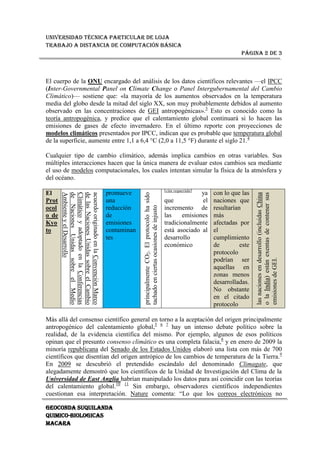 Este documento resume el calentamiento global como el aumento de la temperatura media global desde 1850, acentuado en las últimas décadas del siglo XX y XXI. Explica que el calentamiento global está asociado con el cambio climático y puede ser causado por el ser humano o no. También describe el efecto invernadero como el principal efecto que causa el calentamiento global y cómo los gases de efecto invernadero absorben la energía emitida por la Tierra.