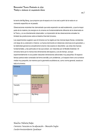El documento describe el Universo como la totalidad del espacio, tiempo, materia y energía que se rige por las mismas leyes físicas. Se originó hace 13,73 mil millones de años en el Big Bang y se ha estado expandiendo desde entonces. Aunque la materia no puede moverse más rápido que la luz, el espacio mismo no tiene esta limitación y puede expandirse aceleradamente, permitiendo que objetos distantes se separen a una velocidad mayor que la de la luz.