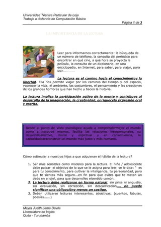La lectura es importante para informarse, viajar y aprender. A través de la lectura se puede conocer la historia y las ideas de otros. La lectura estimula la imaginación y el pensamiento creativo. Psicológicamente, la lectura ayuda a comprender el mundo y a uno mismo, mejorando las relaciones interpersonales. Es importante fomentar la lectura en los niños de manera natural y atractiva para que desarrollen este hábito.