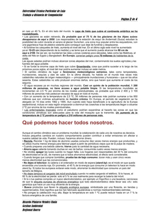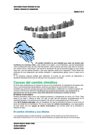 El documento describe los efectos del cambio climático como el derretimiento de los casquetes polares y glaciares, el aumento del nivel del mar, eventos climáticos extremos más frecuentes y escasez de agua. También explica las causas del cambio climático como las emisiones de gases de efecto invernadero procedentes de la energía, el transporte y la agricultura. Finalmente, proporciona consejos sobre cómo los individuos pueden contribuir a mitigar el cambio climático a través de acciones como ahorrar energía,