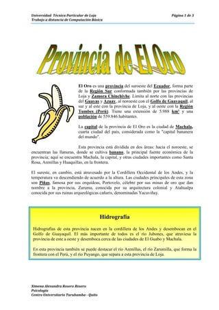 La provincia de El Oro se encuentra en el suroeste de Ecuador. Limita con las provincias de Guayas, Azuay y Loja, así como con Perú. Tiene una extensión de 5,988 km2 y una población de 559,846 habitantes. La capital y ciudad más grande es Machala, conocida como la "capital bananera del mundo". La provincia se divide en dos áreas, las llanuras del noroeste donde se cultiva plátano, y la cordillera del sureste con ciudades como Piñas y Portovelo.