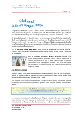 La salud mental implica mantener un equilibrio entre las funciones emocionales, biológicas y espirituales que permite interactuar de forma armoniosa con el entorno y lograr bienestar personal y en las relaciones. Una actitud positiva ante los obstáculos diarios es clave, así como comunicarse de manera asertiva. El estrés y las emociones negativas como celos o ira pueden afectar la salud mental y desencadenar problemas psicosomáticos y enfermedades mentales como depresión o ansiedad.