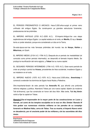 El documento proporciona una descripción general de la historia de Egipto desde los primeros asentamientos humanos hace unos 6.000 años hasta la actualidad. Se detalla la evolución de las dinastías faraónicas que gobernaron el país, incluyendo los Imperios Antiguo, Medio y Nuevo, así como los períodos de dominio persa, helenístico y romano. Finalmente, se ofrece información sobre la cultura egipcia antigua y la situación actual de Egipto como estado independiente y democrático.