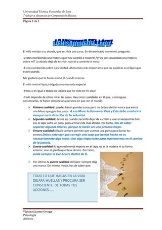 La abuela le cuenta a su nieto que está escribiendo una historia sobre él. Le dice que el lápiz que está usando tiene cinco cualidades importantes que el niño debería adoptar a medida que crezca: 1) dejarse guiar por Dios, 2) aceptar pequeños sufrimientos para mejorar, 3) corregir errores sin vergüenza, 4) enfocarse en lo que hay dentro y no en lo exterior, y 5) ser consciente de que sus acciones dejarán huellas.