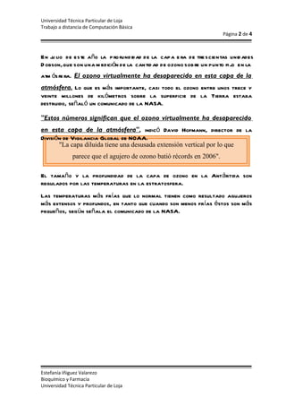 El documento describe cómo el agujero en la capa de ozono sobre la Antártida alcanzó un récord de 27.5 millones de kilómetros cuadrados en septiembre de 2006, lo que representa una reducción significativa del ozono. También señala que la profundidad de la capa de ozono se redujo a solo 85 unidades Dobson en algunas áreas, lo que significa que el ozono había desaparecido virtualmente. Esto se atribuye a las temperaturas más frías de lo normal en la estratosfera durante ese período.