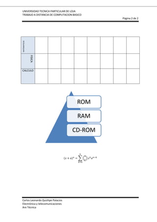 El CD-ROM es un estándar de almacenamiento de archivos informáticos en disco compacto de sólo lectura con una capacidad de 650 MB. Otros estándares son CD-R, CD-RW, CD-I y PhotoCD, cada uno con características específicas. La memoria ROM almacena instrucciones o datos que solo pueden leerse y no modificarse, y contiene el software básico del sistema.
