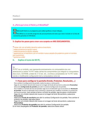 Este documento contiene información sobre el uso de Windows y Microsoft Word. Explica cómo usar accesorios como Paint y WordPad, y cómo crear carpetas y configurar la pantalla en Windows. También incluye instrucciones para aplicar formato de texto, crear tablas y usar herramientas de dibujo en Word.