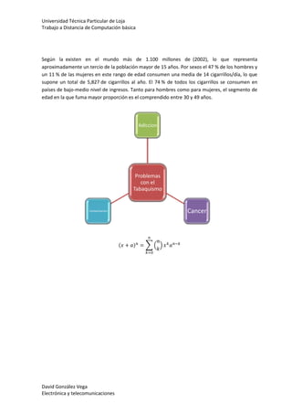 El documento habla sobre los efectos negativos del tabaquismo. El tabaco es altamente adictivo debido a la nicotina y causa dependencia física y psicológica. Fumar está relacionado con muchas enfermedades como cáncer y enfermedades pulmonares y causa más de 50,000 muertes por año en España. Además de los fumadores, el humo del tabaco también afecta a las personas que respiran el mismo aire.