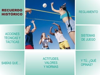 Este documento proporciona información sobre el voleibol, incluyendo su historia, reglas, acciones técnicas y tácticas, sistemas de juego, actitudes y valores, y datos interesantes. El voleibol fue creado en 1895 por William G. Morgan y se ha convertido en un deporte olímpico popular. Se juega entre dos equipos de seis jugadores cada uno, con el objetivo de enviar la pelota al suelo del equipo contrario usando varias acciones como el servicio, remate y bloqueo.
