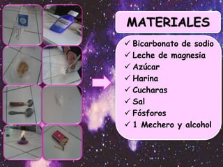 Este documento resume una práctica de laboratorio realizada por 5 estudiantes para analizar diferentes materiales cuando se les aplica una llama. Se colocaron pequeñas cantidades de leche de magnesia, harina, sal, azúcar y bicarbonato de sodio en cucharas y se les acercó un mechero. La leche de magnesia empezó a hervir, la harina se quemó con olor a pan, la sal saltó como chispas y el azúcar se derritió como miel. En conclusión, el azúcar, la harina y la