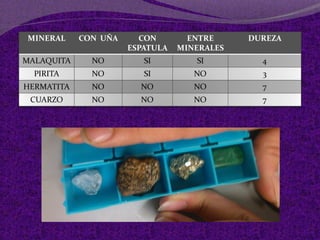 Este documento presenta una práctica de laboratorio sobre la observación y clasificación de minerales. Los estudiantes aprenderán a identificar las propiedades físicas de los minerales, incluyendo su dureza, magnetismo, densidad y cómo distinguir entre sulfuros, carbonatos y haluros. El documento describe los procedimientos de laboratorio para medir la masa, el volumen y la densidad de los minerales, así como para probar su dureza y reactividad química.