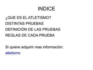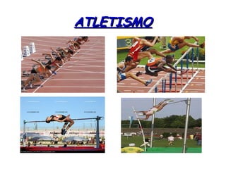 Este documento proporciona una introducción al atletismo, describiendo que consiste en superar el rendimiento de los adversarios en pruebas de velocidad, resistencia, distancia o altura. Explica las distintas pruebas de atletismo, incluyendo carreras, saltos, lanzamientos, pruebas combinadas y marcha, y ofrece definiciones breves de algunas pruebas como carrera, salto de longitud y lanzamiento de jabalina.