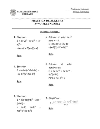 Este documento presenta 15 problemas de álgebra para que los estudiantes de 3er año de secundaria los resuelvan como tarea. Los problemas incluyen simplificar expresiones algebraicas, calcular valores numéricos, resolver ecuaciones y expresiones con variables. El objetivo es que los estudiantes practiquen diferentes operaciones y conceptos algebraicos.