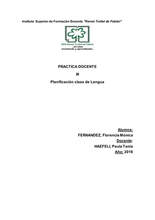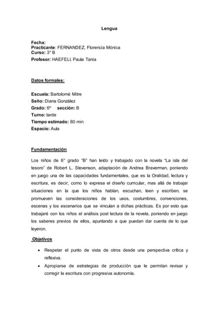 Este documento presenta la planificación de una clase de Lengua para el nivel 6° grado sobre el análisis post lectura de la novela "La isla del tesoro". La clase se centrará en reforzar conceptos como el párrafo y los conectores temporales a través de la revisión de diarios de viaje escritos por los estudiantes basados en la novela. La docente utilizará diferentes actividades como la lectura y corrección de los diarios, para luego definir dichos conceptos y que los estudiantes vuelvan a revisar