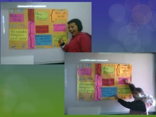 El documento describe una observación de clases en una escuela primaria durante una semana. La autora nota que los maestros usan varias estrategias efectivas como lectura compartida, trabajo en equipos y canciones. Sin embargo, algunos estudiantes aún tienen dificultades con temas como fracciones y trabajar en grupo. La autora enseña sobre fracciones usando diversos materiales y dinámicas participativas que parecen ayudar a los estudiantes a comprender mejor el tema.