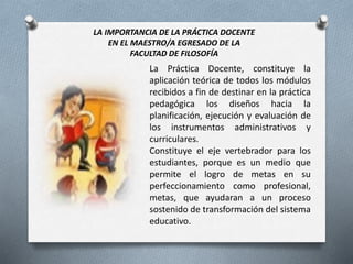 El documento describe la importancia de la práctica docente para los maestros egresados de la Facultad de Filosofía. Explica que la práctica docente permite aplicar los conocimientos teóricos recibidos y desarrollar habilidades de planificación, ejecución y evaluación. Además, la práctica docente permite alcanzar metas de perfeccionamiento profesional que contribuyen a mejorar el sistema educativo. Finalmente, señala que la práctica docente está influenciada por factores como la formación