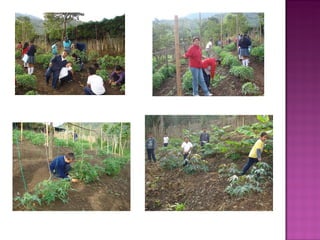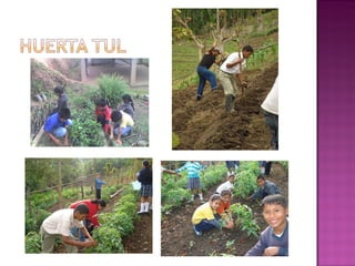 El documento presenta una propuesta para fortalecer el aprendizaje de estudiantes de primaria a través de una huerta escolar. El proyecto busca mejorar la motivación y nutrición de los estudiantes cultivando productos como plátano, yuca y hortalizas. Incluye objetivos, actividades y temas a cubrir en las áreas de ciencias naturales, sociales, español y matemáticas relacionados con la siembra y cuidado de la huerta.