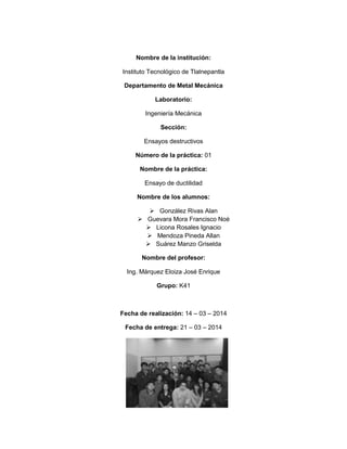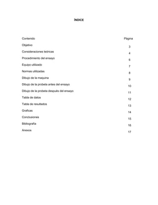 El documento presenta los resultados de un ensayo de ductilidad realizado en una probeta de aluminio. Se determinó la carga máxima y la altura de la copa para tres niveles de deformación de la probeta. Se cumplió el objetivo de evaluar la capacidad de deformación del aluminio mediante los métodos de copa Olsen y Erichsen.