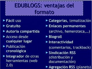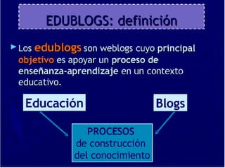 Este documento describe los blogs o webslogs. Explica que son espacios de comunicación en línea que contienen artículos escritos por uno o más autores de forma cronológica. Menciona diferentes tipos como fotoblogs, videoblogs y audioblogs. Además, señala que los blogs pueden usarse para cualquier disciplina educativa y que también sirven como portafolios estudiantiles para mostrar trabajos y progreso.
