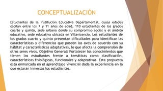 Este documento describe una propuesta educativa para fortalecer los conocimientos de 110 estudiantes de cuarto y quinto grado sobre las aves. La propuesta incluye mostrar un video explicativo sobre las aves, realizar actividades didácticas en tabletas sobre aves, y crear un video grupal identificando la diversidad de aves del país y la región. El objetivo es mejorar la comprensión de los estudiantes sobre las características, clasificación y adaptaciones de las aves a través de una experiencia vivencial e interactiva utilizando tecnologías