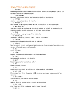 MS-DOS era un sistema operativo popular para las computadoras IBM PC y compatibles que utilizaba una interfaz de línea de comandos. Permitía ejecutar comandos básicos como DIR para ver archivos, DEL para eliminar archivos, y FORMAT para formatear discos. MS-DOS incluía utilidades como DISKCOPY para copiar discos y TREE para ver la estructura de carpetas.