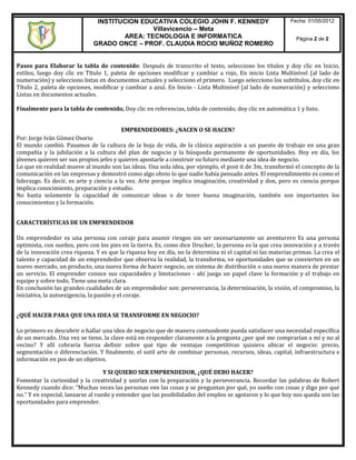 imagenes y una tabla de contenidos. También incluye información sobre emprendedores y lo que se requiere para tener éxito