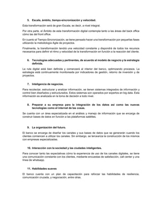 Banco Solidario S.A., especializado en microfinanzas en Bolivia, busca transformar digitalmente sus operaciones para mejorar la adopción de servicios digitales por parte de sus clientes. La estrategia incluye identificar tecnologías adecuadas, evaluar costos de transformación y fomentar la interacción con los clientes a través de encuestas y comunicación constante. Se priorizan competencias digitales que permitirán al banco adaptarse a una nueva era de economía digital, manteniendo un enfoque tanto a corto como a largo plazo.