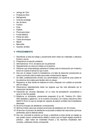 Este documento describe una práctica de laboratorio sobre la intoxicación por etanol en un cobayo. Los objetivos fueron observar la sintomatología del cobayo y verificar la presencia de etanol mediante reacciones químicas. Se administró etanol al cobayo por vía intraperitoneal e involucró la observación del animal, disección post mortem, destilación y reacciones químicas. El cobayo murió a las 2 horas mostrando convulsiones, respiración lenta e inmovilidad total. Las reacciones confirmaron la